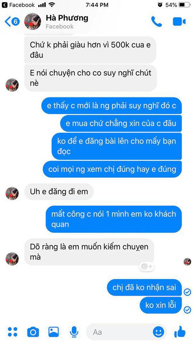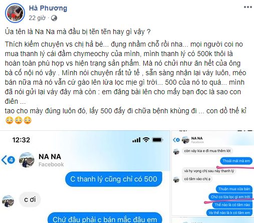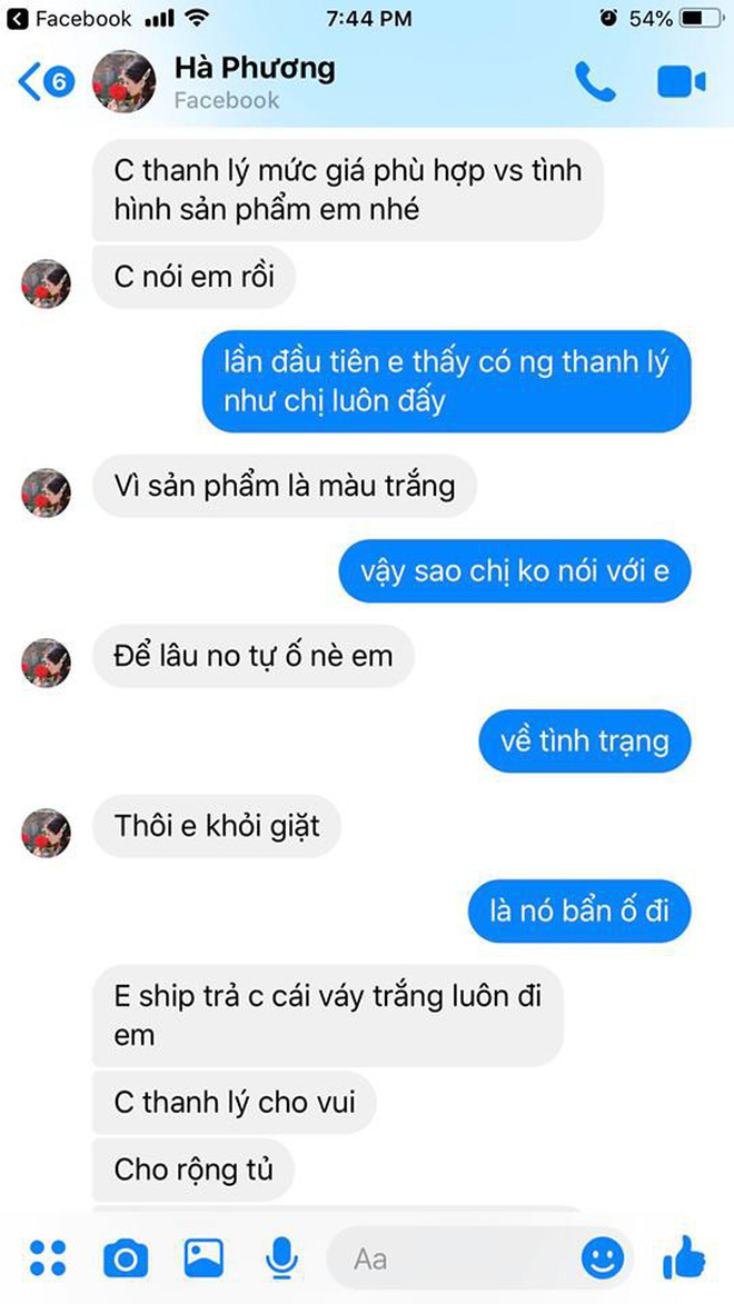 Sau đó chiếc váy được bạn Na Na mua lại, nhưng sau khi nhận thì khách hàng nhắn đồ bị lỗi. Nhận được phản ánh, Hà Phương nói khách hàng ship đồ lại rồi Hà Phương sẽ hoàn tiền, nhưng bạn ấy vẫn bảo là lừa lọc rồi tiếp tục có những lời lẽ không hay, xúc phạm cô. “Vừa được chửi vừa được trả tiền, bạn quá láo rồi, nói chuyện đàng hoàng thì cái gì cũng có, còn không thì thôi“. Hà Phương chia sẻ.