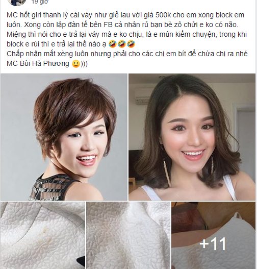 Cô gái lên tiếng tố có nickname là Na Na đã viết như sau: “MC hot girl thanh lý cái váy như giẻ lau nhà với giá 500k cho em xong block luôn Facebook. Đã thế còn lập đàn tế trên trang cá nhân, rủ bạn bè vô chửi em. Miệng nói cho em trả váy lại mà em không chịu, là em muốn kiếm chuyện, mà bây giờ block thì em trả lại thế nào. Chấp nhận mất tiền luôn nhưng phải cho chị em biết để chừa chị ra nhé!“.