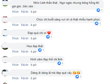 Dưới bài viết, bên cạnh những lời khen về thân hình quyến rũ, dân mạng cũng xuýt xoa đến hình xăm hoa hồng của MC Hoàng Linh. Người hâm mộ bình luận: “Thần thái quá chị Linh ơi”, “Dáng ải dáng ai mà đẹp quá vậy”, “Bông hồng đẹp đấy”, “Nhìn Linh thần thái, ngơ ngác nhưng bông hồng thì sắc sảo, gai góc”…