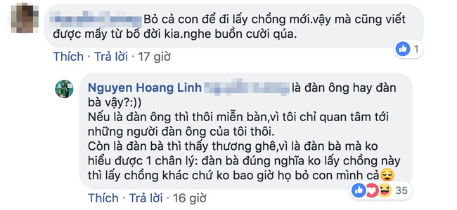 Những tưởng mọi việc đã xong xuôi, ai dè anti-fan vẫn chưa buông tha cho Hoàng Linh. Vẫn có một vài bình luận tiếp tục chỉ trích, mỉa mai cô: “Bỏ cả con để đi lấy chồng thế mà cũng viết được mấy từ kia. Nghe buồn cười quá” hay “Thiết nghĩ ly hôn mà để cho chồng nuôi cả hai con, đúng chị là người đàn bà bản lĩnh thật”.