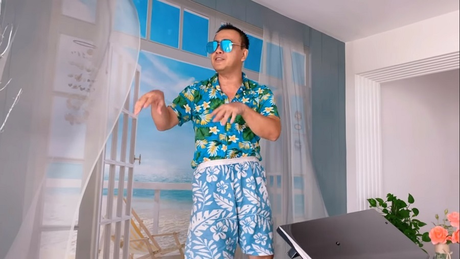 Mở đầu đoạn clip, Quyền Linh ngồi tựa mình trên chiếc ghế mây tròn hài hước giới thiệu: “Thưa quý vị, tôi đang ở bãi biển nổi tiếng nhất thế giới. Trong những ngày cách ly này, chỉ có đi tắm biển mới mát thôi. Nói đến biển, ta nghĩ đến tình yêu, tình yêu thì dạt dào như sóng biển…”.
