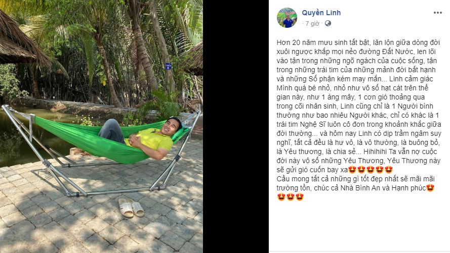 Trên trang cá nhân, bên cạnh bức ảnh nằm nghỉ ngơi trên võng giữa miền quê thanh bình, anh tâm sự: “Hơn 20 năm mưu sinh tất bật, lăn lộn giữa dòng đời xuôi ngược, len lỏi vào tận trong những ngõ ngách của cuộc sống, tận trong những trái tim của những mảnh đời bất hạnh và những số phận kém may mắn… Linh cảm giác mình quá bé nhỏ, nhỏ như vô số hạt cát trên thế gian này, như một áng mây, một cơn gió thoảng qua trong cõi nhân sinh.