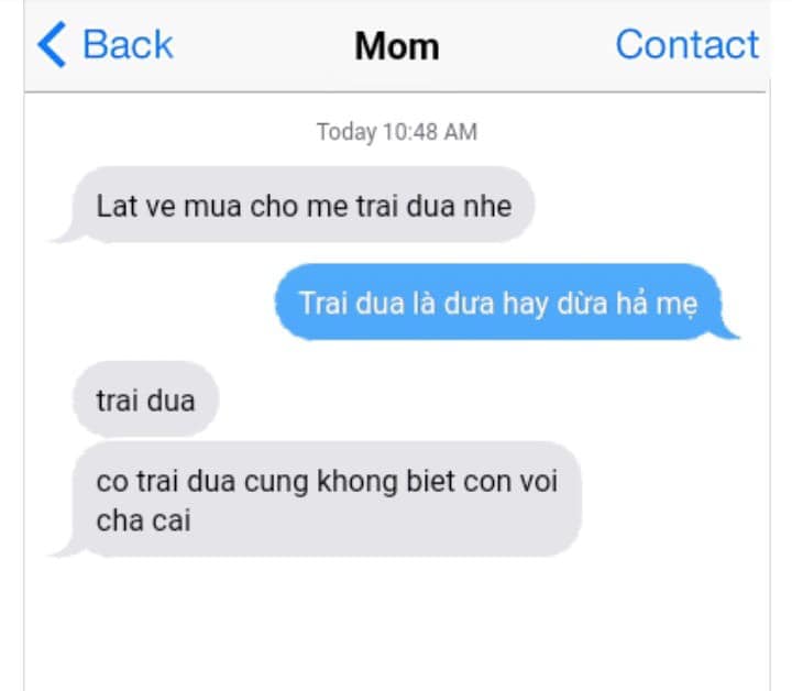 Có thể thấy trong tin nhắn, người mẹ này đã nhắn cho đứa con tin nhắn không dấu: ”Lat ve mua cho me trai dua nhe” (tạm dịch: Lát về mua cho mẹ *trai dua* nhé). Và khi đứa con ngây thơ hỏi lại có dấu đàng hoàng rằng ”Trai dua là dưa hay dừa hả mẹ?”, thì liền bị người mẹ ”phủ đầu” không thương tiếc: ”Trai dua. Co trai dua cung khong biet con voi cha cai” (tạm dịch: *trai dua*. Có *trai dua* cũng không biết, con với chả cái)