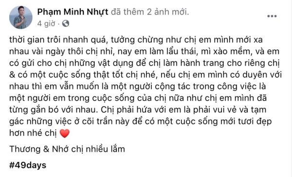 Trên trang cá nhân, anh viết: “Thời gian trôi nhanh quá, tưởng chừng như chị em mình mới xa nhau vài ngày thôi chị nhỉ, nay em làm lẩu thái, mì xào mềm, và em có gửi cho chị những vật dụng để chị làm hành trang cho riêng chị. Có 1 cuộc sống thật tốt chị nhé, nếu chị em mình có duyên với nhau thì em vẫn muốn là 1 người cộng tác trong công việc, là 1 người em trong cuộc sống của chị nữa, như chị em mình đã từng gắn bó với nhau. Chị phải hứa với em là phải vui vẻ và tạm gác những việc ở cõi trần này để có 1 cuộc sống mới tươi đẹp hơn nhé chị”.