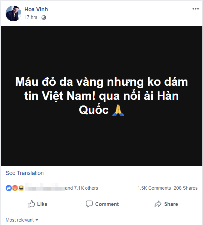 Cụ thể, trước khi trận đấu bán kết ASIAD 2018 giữa Việt Nam và Hàn Quốc, Hoa Vinh phát biểu một câu “xanh rờn” rằng: “Máu đỏ da vàng nhưng không dám tin Việt Nam qua nổi ải Hàn Quốc“.