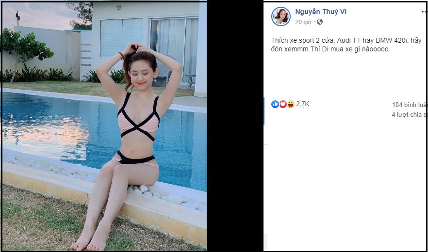 Ở một diễn biến khác, không biết vô tình hay cố ý, mới đây, Thúy Vi cũng đăng tải một status liên quan đến việc sắm xe hơi Cô viết: ”Thích xe sport 2 cửa, Audi TT hay BMW 420i, hãy đón xem Thúy Vi mua xe gì nào!”. Status nhanh chóng nhận về sự chú ý, nhưng hài hước nhất là có fan thẳng thắn đề cập tới việc Midu vừa mua xe bên dưới bài viết.