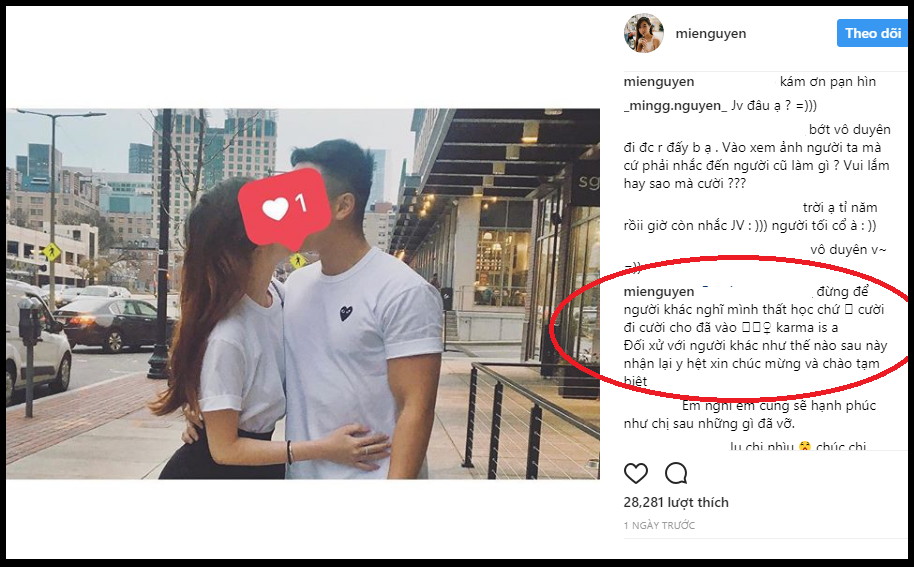 Đơn cử như mới đây, khi Mie đăng ảnh tình cảm với bạn trai lên mạng xã hội, một anti-fan đã bình luận khá vô duyên khi nhắc tới JV. Cụ thể người này hỏi ”JV đâu ạ?” kèm icon cười vui vẻ. Comment này nhanh chóng nhận được ”gạch đá” của cư dân mạng. Nhưng điều bất ngờ nhất là Mie lên tiếng đáp trả vô cùng mạnh mẽ người dùng này.