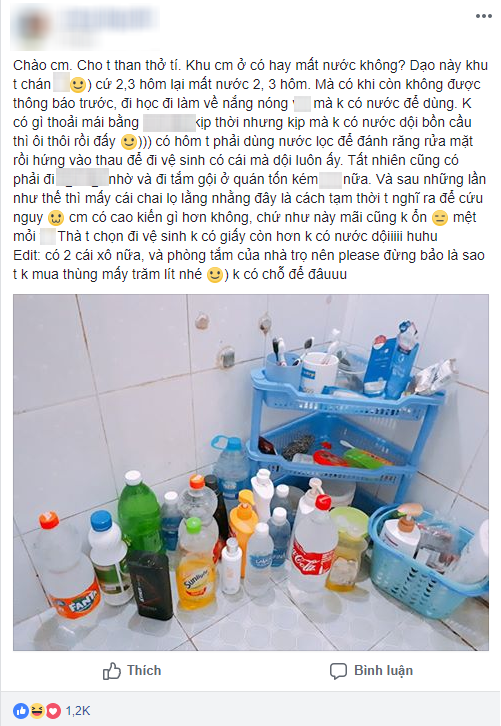 “Vào một buổi sáng đẹp trời, nắng đẹp gió thổi hiu hiu, 1 phòng 4 đứa con gái cùng dậy đi học nhưng mất nước sạch. Hẩm hiu là mùa hè nước trong bình RO cũng cạn, cuối cùng 1 đứa phải bịt như ninja chạy bộ 500 m thể dục buổi sáng ra quán tạp hóa mua mấy chai nước lít rưỡi về. Đến tối về người mồ hôi mồ kê vẫn không có nước, 4 đứa phải mặt dày kéo nhau vào nhà nghỉ tắm…”, một cô bạn buồn rầu chia sẻ hoàn cảnh “éo le” của mình.