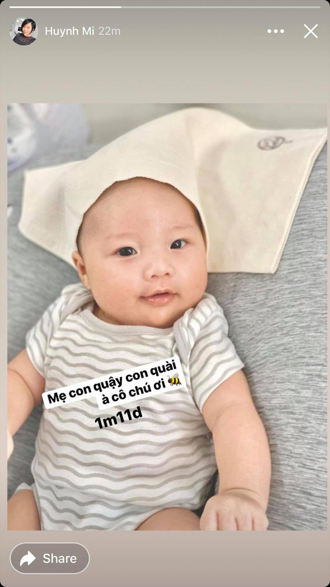Mới đây, Huỳnh Mi khiến cư dân mạng không khỏi “bật cười” khi chia sẻ hình ảnh hài hước của “tiểu công chúa” với caption: “Mặt tui hề lắm hả? Con là con gái đó”. Có thể thấy, nhóc tỳ nhà Huỳnh Mi gây chú ý với gương mặt bụ bẫm, đôi mắt cười giống bố và nụ cười mang tính giải trí cực cao.