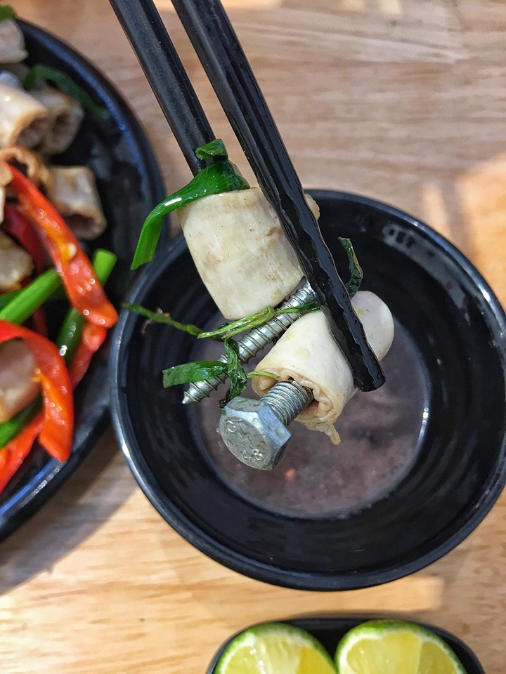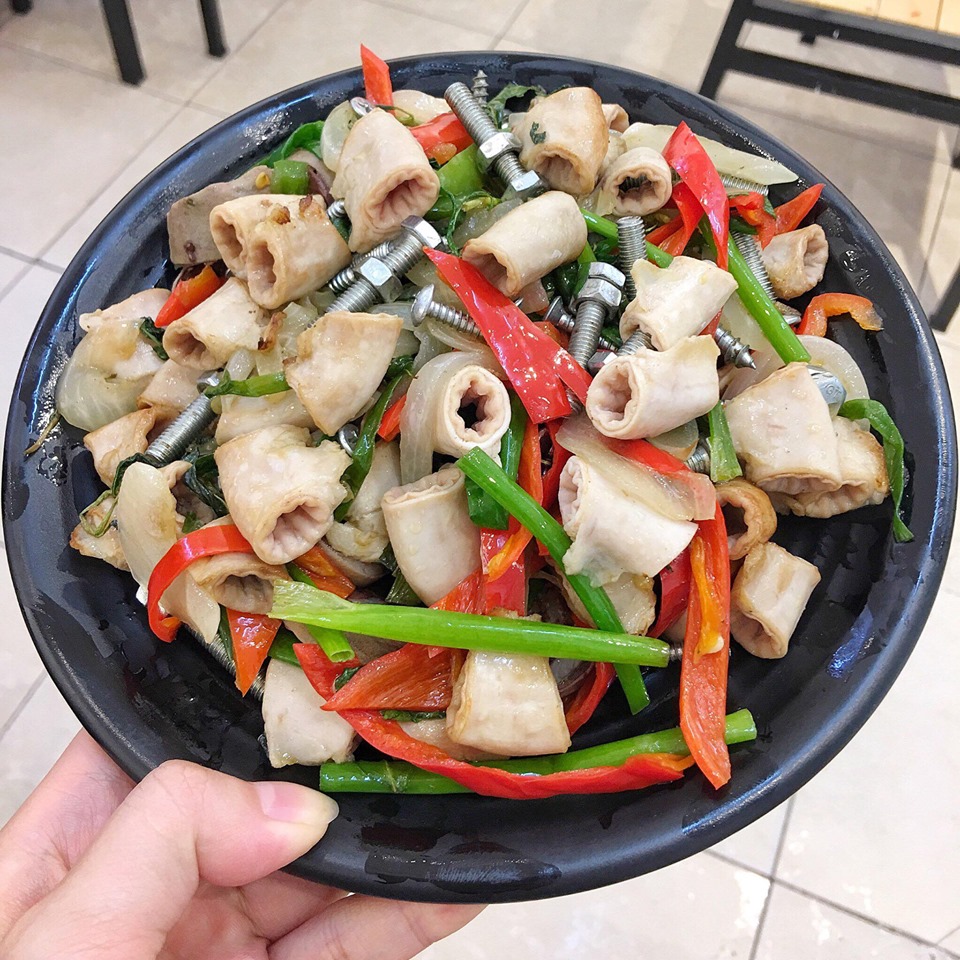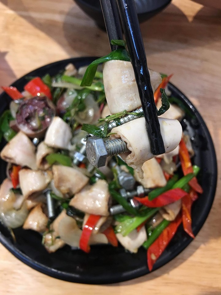 Tuy nhiên, thay vì là món lòng xào như truyền thống thường thấy, một quán ăn ở Hà Nội đã thêm một nguyên liệu có phần “sai sai” khiến ai nhìn cũng phải dừng hình: lòng xào ốc… vít.