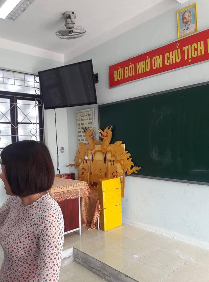 Không hiểu lý do gì hay nhân dịp gì mà cả lớp lại đầu tư hẳn “chiếc ghế quàng thượng” cho cô giáo nhưng nhờ chiếc ghế độc đáo này mà cô có vẻ rất vui vẻ, hào hứng không kém các trò.