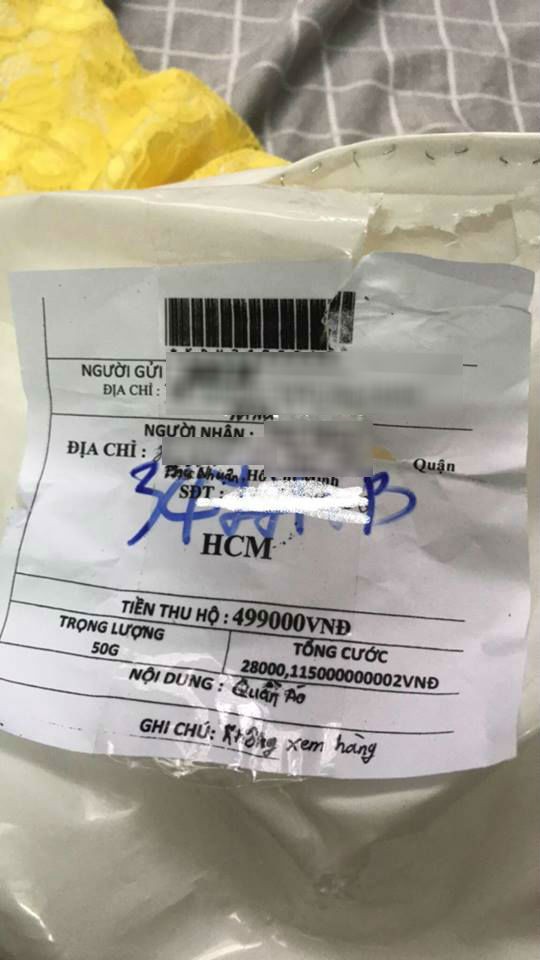 Mình không hề đặt quần áo, váy đầm gì cả. Thế mà chúng nó gửi đến người nhận tên mình, số điện thoại người yêu mình và địa chỉ cơ quan người yêu mình! Nó gửi tới 1 cái váy như giẻ rách! 499k, là 499k nha các bạn. Người yêu mình gọi điện thoại cho mình không được nên nghĩ chắc mình đặt nên trả tiền lấy luôn. Lúc mình nhận thì chuyện đã rồi! Chỉ muốn chửi thề! 499k - mình không tiếc mà mình uất ức vì bị lừa.