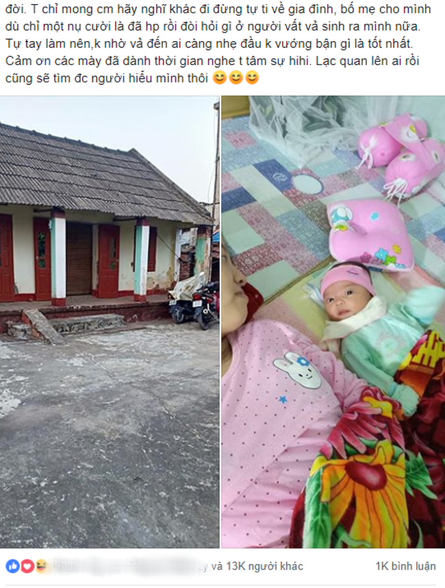 Mình chỉ muốn các bạn hãy nghĩ rằng là nghèo không phải cái tội, tội là do mình tạo ra thôi. Cuộc sống hạnh phúc bên gia đình nhỏ là điều sung sướng nhất cuộc đời. Mình chỉ mong các bạn hãy nghĩ khác đi, đừng tự ti về gia đình, bố mẹ cho mình dù chỉ một nụ cười là đã hạnh phúc rồi, đòi hỏi gì ở người vất vả sinh ra mình nữa. Tự tay làm nên, không nhờ vả đến ai càng nhẹ đầu, không vướng bận gì là tốt nhất.