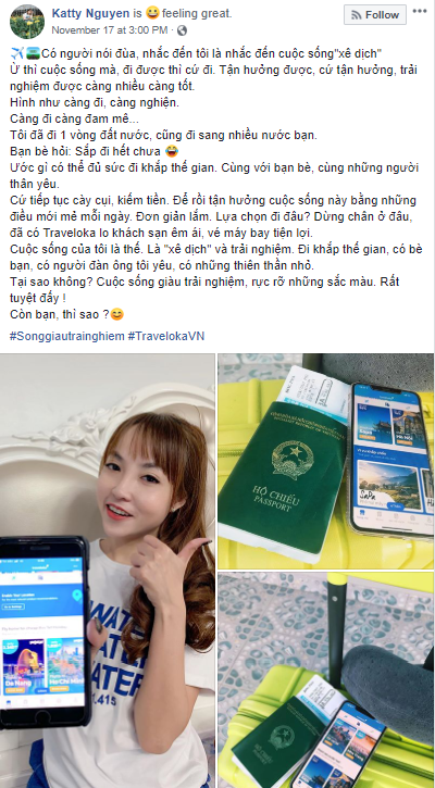 “Sống giàu trải nghiệm” cũng là thông điệp của Traveloka - ứng dụng du lịch hàng đầu Đông Nam Á - cổ vũ mọi người thoả sức vi vu trên những hành trình mới, để được trải nghiệm những điều lạ “ở một nơi xa”. Trong không khí mùa lễ hội háo hức thì thông điệp này lại càng rộn ràng hơn bao giờ hết.