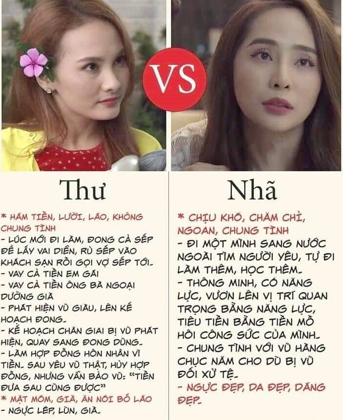 Theo đó, người ta cho rằng về ngoại hình, Nhã ”ăn đứt” Thư khi ”Ngực đẹp, da đẹp, dáng đẹp”, còn Thư thì ”lép, móm, già, lùn”. Về tính cách, Thư là một cô gái ”Hám tiền, lười, láo, không chung tình”, đi kèm là những dẫn chứng như đong đưa sếp, vay tiền em gái và ông bà, cưa Vũ vì Vũ giàu…