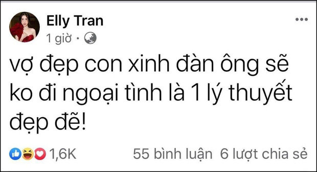Không có quá nhiều chia sẻ về chuyện gia đình, tình cảm thế nhưng thời gian gần đây Elly Trần khiến nhiều người lo lắng khi thường xuyên chia sẻ những dòng trạng thái buồn bã, bất an trên trang cá nhân. Không những thế, những dòng chia sẻ về việc ngoại tình đang khiến nhiều người dấy lên nghi ngờ ông xã của Elly Trần đang có mối quan hệ ngoài luồng.