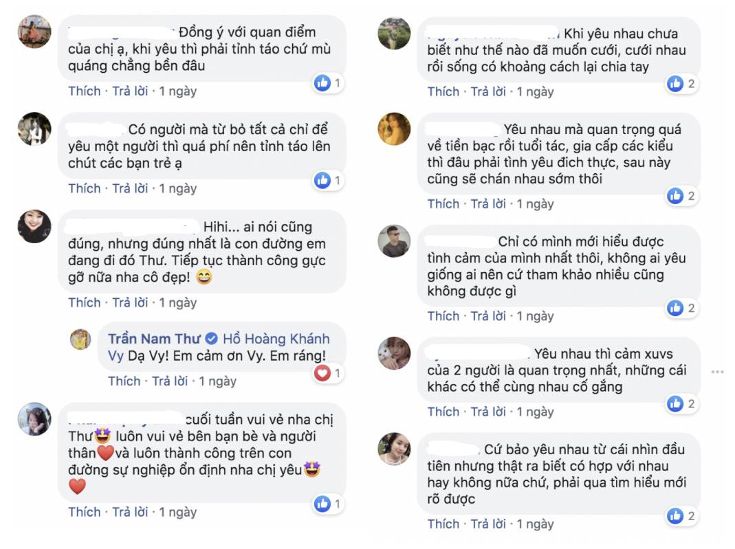 Ngay sau đó, bài viết của Nam Thư nhanh chóng đã thu hút sự chú ý của cư dân mạng. Có rất nhiều bình luận ủng hộ ý kiến của cô như: “Chị Thư nói đúng lắm. Em nghĩ khi yêu cũng phải cân nhắc xem thu nhập, tuổi tác, gia thế để tính chuyện đường dài. Chứ cứ nhắm mắt mà yêu rồi cưới theo con tim, cảm xúc thì quá thiếu thực tế”.