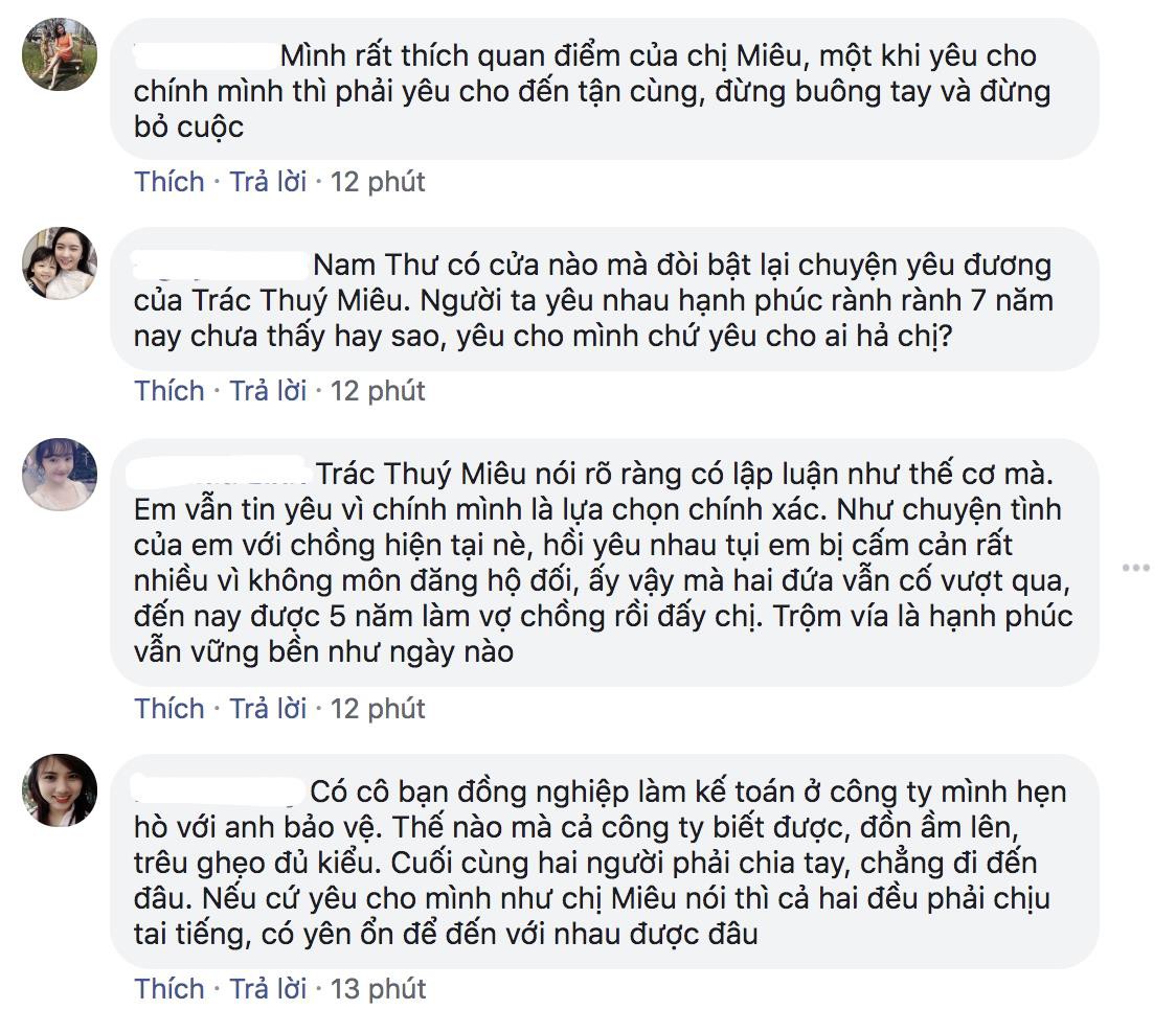 Hiện tại, dòng trạng thái của Nam Thư đang nhận được rất nhiều bình luận ủng hộ và cả phản đối của cư dân mạng. Đồng thời, quan điểm “yêu cho mình” của Trác Thúy Miêu cũng thu hút rất nhiều ý kiến của dư luận. Dù cho có rất nhiều người phản bác về phát ngôn của mình nhưng cô vẫn một mực giữ vững quan điểm và chưa có bất cư phản hồi nào.