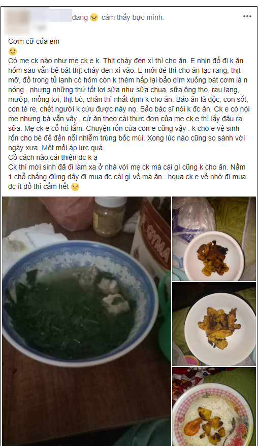 Em mới đẻ xong thì cho ăn lạc rang, thịt mỡ, đồ trong tủ lạnh có hôm còn không hấp và bảo dìm xuống bát cơm là nóng. Thịt cháy đen sì em không ăn được nên em đổ đi, đến hôm sau lại mang một bát thịt kia vào tiếp. Trong khi đó những món ăn lợi sữa cho bà đẻ như sữa chua, rau lang, mồng tơi, chân giò thì nhất quyết không cho em động đũa. Mẹ chồng bảo ăn là có độc, con sốt rồi nguy hiểm này nọ, rồi còn bảo bác sĩ dặn không được ăn.