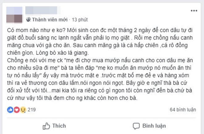 Mới đây, một nàng dâu có tài khoản Facebook tên N.L. đã chia sẻ câu chuyện của mình: