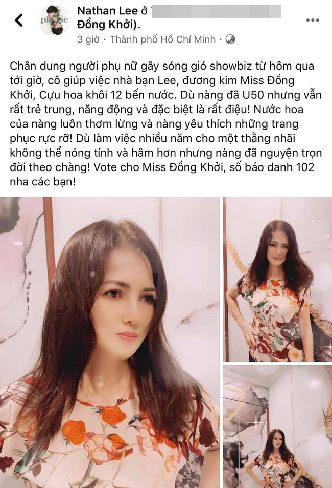 Kèm với những tấm hình được chụp qua app làm mịn da là dòng chia sẻ bông đùa của nam ca sĩ: “Chân dung người phụ nữ gây sóng gió showbiz từ hôm qua tới giờ, cô giúp việc nhà bạn Lee, đương kim Miss Đồng Khởi, cựu hoa khôi 12 bến nước. Dù nàng đã U50 nhưng vẫn rất trẻ trung, năng động và đặc biệt là rất điệu! Nước hoa của nàng luôn thơm lừng và nàng yêu thích những trang phục rực rỡ! Dù làm việc nhiều năm cho một thằng nhãi không thể nóng tính và hâm hơn nhưng nàng đã nguyện trọn đời theo chàng! Vote cho Miss Đồng Khởi, số báo danh 102 nha các bạn!”