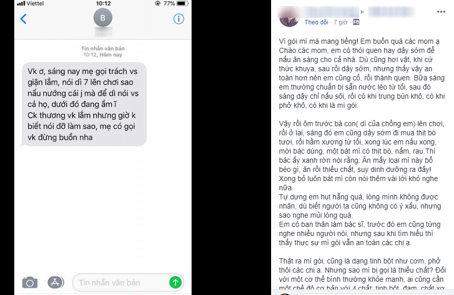 “Vì gói mì mà mang tiếng! Em buồn quá các mom ạ! Em có thói quen hay dậy sớm để nấu ăn sáng cho cả nhà. Dù cũng hơi vật khi thức khuya rồi dậy sớm, nhưng thấy vậy an toàn hơn nên em cũng cố gắng, sau thành quen. Bữa sáng, em thường chuẩn bị sẵn nước lèo từ tối, sau đó sáng dậy chỉ nấu sôi, rồi có khi ăn bún khô, phở khô có khi là mì gói.
