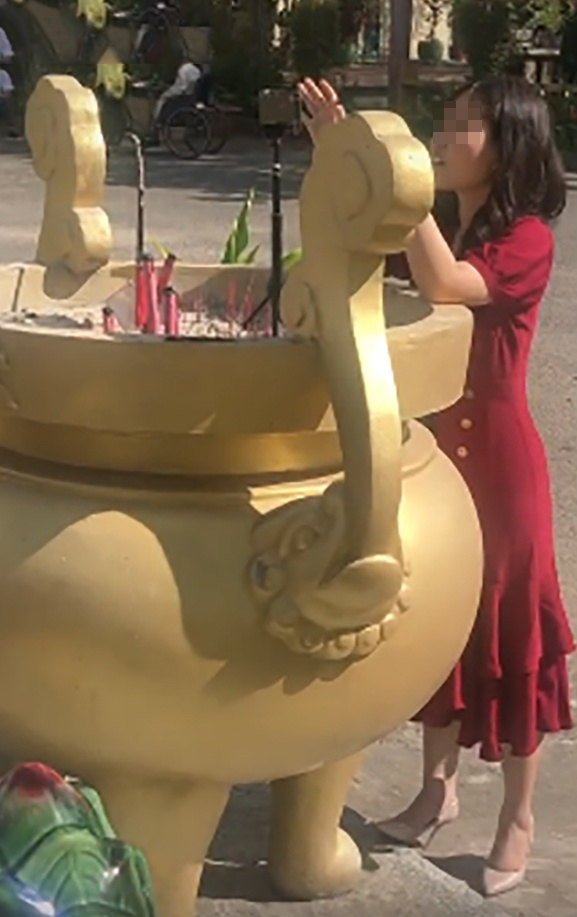 Đỉnh điểm của làn sóng phẫn nộ trong cư dân mạng phải kể đến việc một cô gái cắm thẳng gậy chụp hình vào lư hương của chùa để chụp ảnh sống ảo. “Ăn mặc đẹp đẽ như vậy mà hành động thiếu ý thức đến không thể chấp nhận được”, tài khoản L.T bình luận.