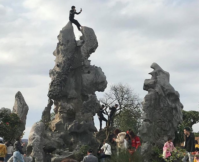 Ngày 29/1, những hình ảnh và cả đoạn clip quay lại cảnh một thanh niên leo lên tảng đá cao tại chùa Nôm (Hưng Yên) được lan truyền trên mạng xã hội. Dù độ cao khá nguy hiểm, phía dưới lại có nhiều người nhưng anh ta vẫn thoải mái đưa máy ảnh lên tự sướng, chụp khung cảnh xung quanh bất chấp những cái nhìn hằn học của mọi người.