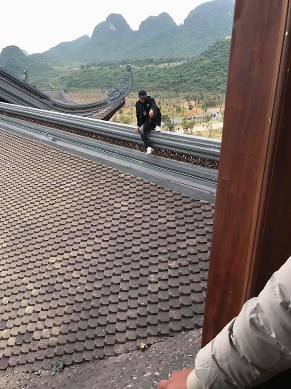 Chưa dừng lại ở đó, một cô gái cũng có hành động tương tự. Cặp đôi trèo lên mái chùa chỉ để “sống ảo”. Thậm chí chàng trai còn chạy nhảy trên cao, bất chấp sự chỉ trích của nhiều người xung quanh.