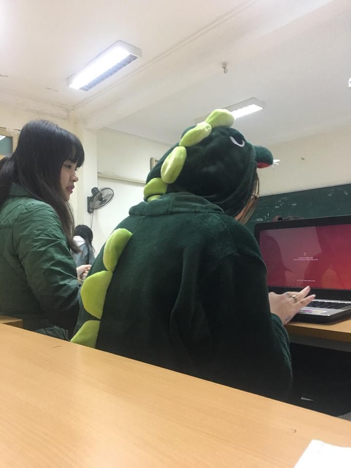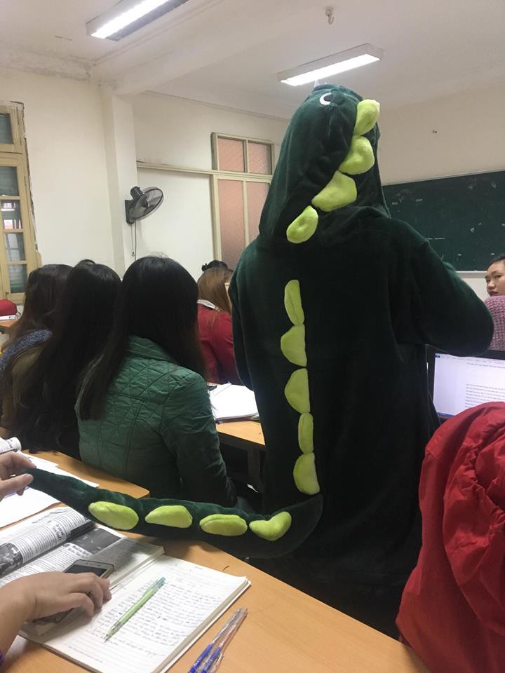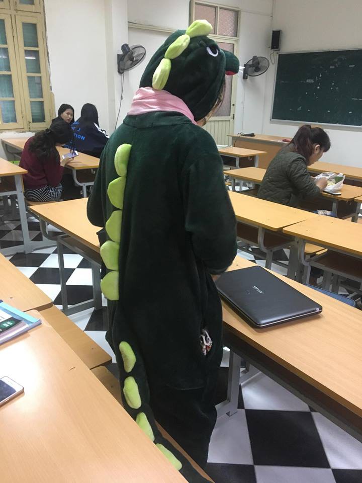 Thay vì mặc những trang phục quen thuộc của mùa lạnh như áo bông, khăn choàng, bao tay, mũ len, cô bạn này đã hóa thân thành một con khủng long ngay giữa phòng học. Bộ quần áo khủng long liền thân không chỉ làm ấm cơ thể mà còn khiến cô bạn này trở thành nhân vật “hot” nhất trong ngày.