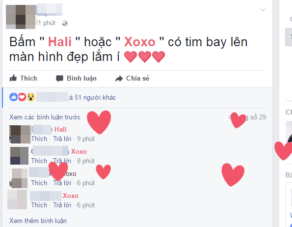 Ngày 27/7, tràn ngập khắp newfeeds Facebook đâu đâu cũng thấy những dòng trạng thái, bình luận kêu gọi comment hai từ “Hali” và “xoxo” để thấy điều đặc biệt. Dân tình thi nhau để lại 2 từ khóa trên và kết quả nhận được là tràn ngập màn hình một “vùng trời” đầy trái tim. Chưa biết ý nghĩa đằng sau là gì, thế nhưng cái mang lại trước mắt chính là niềm vui và sự yêu đời của tất cả những người đang sử dụng Facebook.