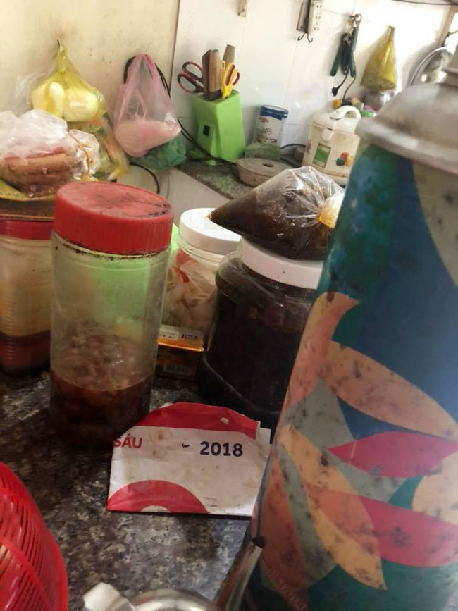 Những hũ mắm, lọ gia vị không nhìn rõ là gì để trên bàn bếp. (Ảnh: Facebook)