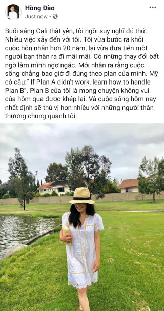 Cô viết: “Buổi sáng Cali thật yên, tôi ngồi suy nghĩ đủ thứ. Nhiều việc xảy đến với tôi. Tôi vừa bước ra khỏi cuộc hôn nhân hơn 20 năm, lại vừa đưa tiễn một người bạn thân ra đi mãi mãi. Có những thay đổi bất ngờ làm mình ngơ ngác. Mới nhận ra rằng cuộc sống chẳng bao giờ đi đúng theo kế hoạch của mình. Người Mỹ có câu nếu kế hoạch A của bạn thất bại, hãy bắt tay ngay vào thực hiện kế hoạch B. Kế hoạch B của tôi là mong chuyện không vui của hôm qua được khép lại. Và cuộc sống hôm nay nhất định sẽ thú vị hơn nhiều với những người thân thương chung quanh tôi”.