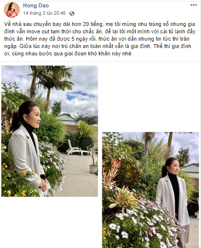 Mới đây, trên trang cá nhân, nghệ sĩ Hồng Đào tiết lộ mình đang tự cách ly tại nhà riêng ở Mỹ để đảm bảo an toàn cho người thân. Nữ nghệ sĩ viết: “Về nhà sau chuyến bay dài hơn 20 tiếng, mẹ tôi mừng như trúng số nhưng gia đình vẫn chuyển đi tạm thời cho chắc ăn, để lại tôi một mình với cái tủ lạnh đầy thức ăn.
