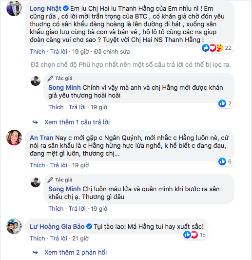 Bên cạnh đó, các nghệ sĩ cũng bày tỏ sự ủng hộ dành cho nghệ sĩ Thanh Hằng. Ca sĩ Long Nhật cho biết: “Em cũng rứa, có lời mời trân trọng của ban tổ chức, có khán giả chờ đón yêu thuơng, có sân khấu đàng hoàng là lên đường đi hát. Xuống sân khấu giao lưu cùng bà con và bán vé, hô lô tô cùng các nghệ sĩ giúp đoàn càng vui chớ sao? Tuyệt vời chị Hai Thanh Hằng”. Diễn viên Gia Bảo bức xúc: “Bọn tào lao. Má Hằng tui hay xuất sắc”.