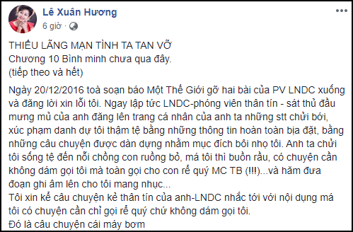 Sau một loạt bài kéo dài đến tận 10 chương để “vạch trần” chồng cũ Thanh Bạch và cuộc sống hôn nhân không khác gì “địa ngục” của mình, mới đây nghệ sĩ Xuân Hương cũng đã chính thức khép lại mọi thứ với phần hai chương mười - cũng là phần cuối của 10 chương “tự truyện”.