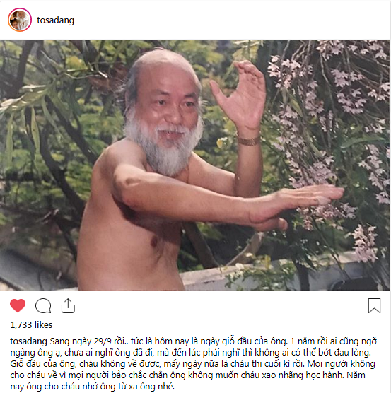 “Sang ngày 29/9 rồi… Tức là hôm nay là ngày giỗ đầu của ông. 1 năm rồi ai cũng ngỡ ngàng ông ạ, chưa ai nghĩ ông đã đi, mà đến lúc phải nghĩ thì không ai có thể bớt đau lòng. Giỗ đầu của ông, cháu không về được, mấy ngày nữa là cháu thi cuối kì rồi. Mọi người không cho cháu về vì mọi người bảo chắc chắn ông không muốn cháu xao nhãng học hành. Năm nay ông cho cháu nhớ ông từ xa ông nhé.