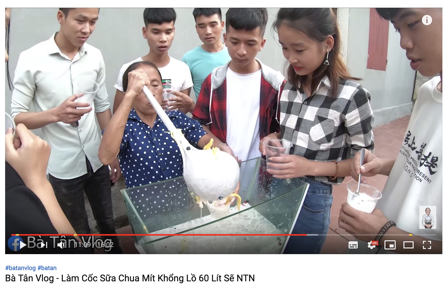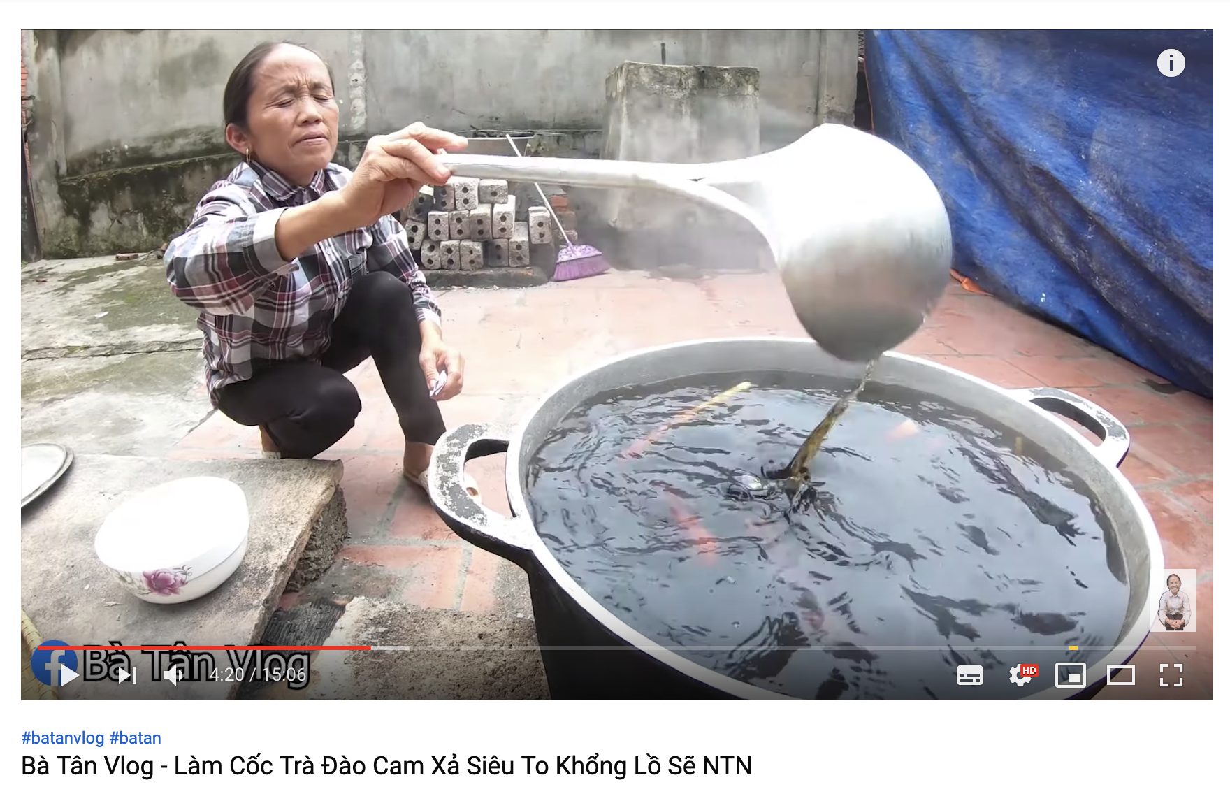 Đó là một vài bình luận của cư dân mạng. Lục lại các Vlog của bà Tân, có thể thấy, cảnh trên được cắt từ một clip bà thực hiện món Trà sữa khổng lồ 60 lít.