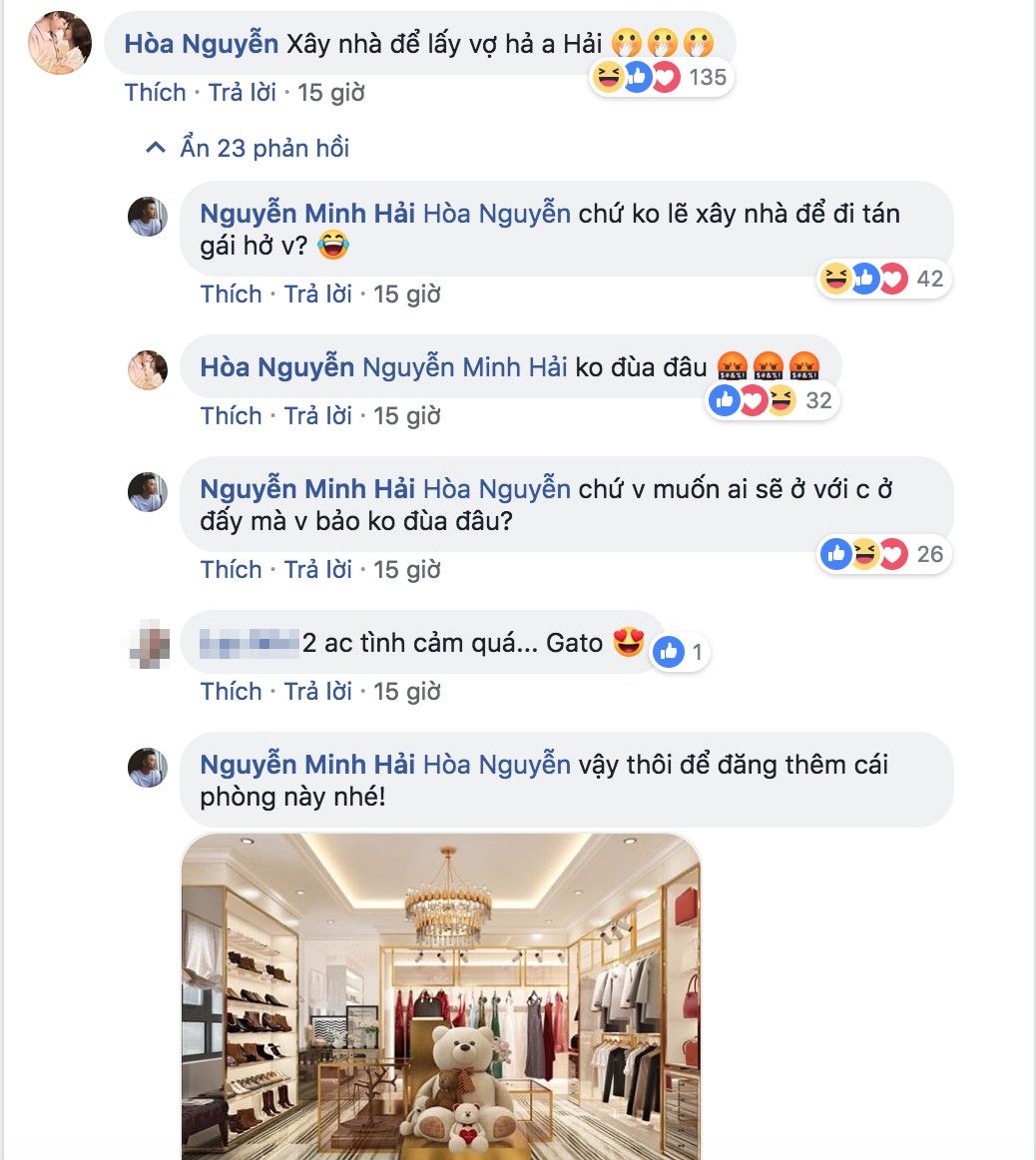 Dưới phần bình luận, giọng ca người Bắc Ninh hỏi bạn trai: “Xây nhà để lấy vợ hả anh Hải?” và nam thiếu gia này đáp: “Chứ không lẽ xây nhà để đi tán gái hả vợ? Chứ vợ muốn ai sẽ ở với chồng?”. Bạn trai mặn mà là vậy nhưng Hòa Minzy có vẻ chưa muốn lấy chồng, cô nàng hài hước: “Ôi chưa cưới mà người ta đã làm phòng để đồ cho luôn rồi à? Định xích tôi lại à. Tôi gọi Liều (tên FC của Hòa Minzy - PV) con vào đây bây giờ”.