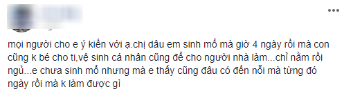 Cô em chồng than thở: “Mọi người cho em xin ý kiến ạ. Chị dâu em sinh mổ 4 ngày rồi mà con cũng không bế cho ti, vệ sinh cá nhân cũng để cho người nhà làm, chỉ nằm rồi ngủ.