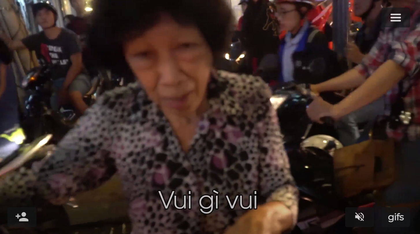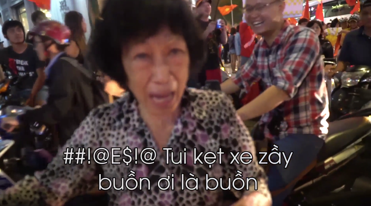 Bà cụ trong clip đã rất lớn tuổi, đi xe đạp băng qua 1 ngã tư lớn, nhưng dòng người đổ về quá đông, gây ùn tắc khiến bà mãi không sang được đường. Thế nên khi được hỏi “bà ơi bà có thấy vui không?”, bà chẳng ngần ngại trả lời rằng “Đường Nguyễn Trãi nè, trải trải dài dài vậy đâu qua được đâu” kèm thêm vẻ mặt “hờn dỗi cả thế giới” khiến dân mạng được trận cười thích thú.