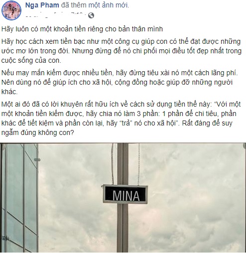 Theo đó, Mina Phạm muốn nhắn nhủ tới các con phải luôn có một khoản tiền riêng cho bản thân. Luôn dùng tiền có mục đích nhưng không nên để nó chi phối cuộc sống quá nhiều. Và dù có giàu có tới đâu cũng không được phép lãng phí mà hãy dùng nó để giúp đỡ mọi người xung quanh. Chia sẻ đã nhanh chóng nhận được sự đồng tình từ phía dân mạng. Có thể thấy, dù cuộc sống giàu có là vậy nhưng Mina Phạm vẫn luôn có những nguyên tắc riêng trong việc chi tiêu cùng cách dạy con rất khéo léo.