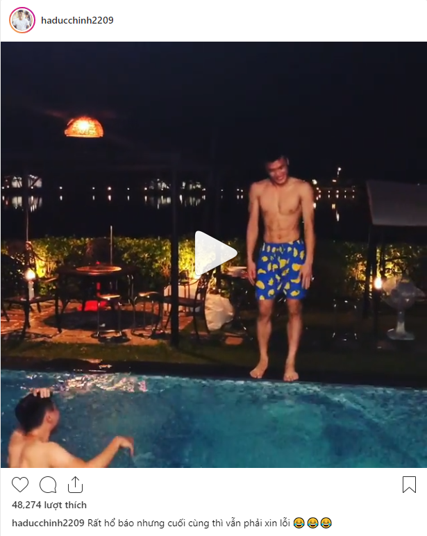 Đoạn clip gây ấn tượng nhất ở phân cảnh Bùi Tiến Dũng nhún nhảy xuống hồ bơi một cách khá kỳ quặc nhưng cũng rất đáng yêu. Dù không rõ ngọn ngành sao phải xin lỗi Chinh bằng cách lăn xuống hồ bơi, nhưng cách đánh lừa đồng đội cùng lao hết xuống hồ trước và biểu cảm đáng yêu của chàng trai xứ Thanh cũng đủ khiến bao chị em phải đau tim.