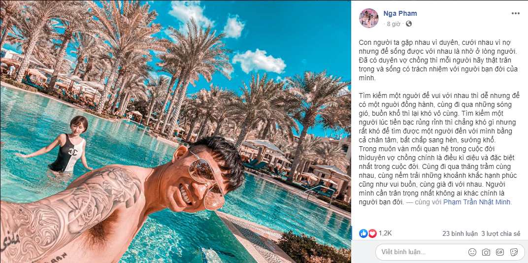 Vợ Minh Nhựa viết: “Con người ta gặp nhau vì duyên, cưới nhau vì nợ nhưng để sống được với nhau là nhờ ở lòng người. Đã có duyên vợ chồng thì mỗi người hãy thật trân trọng và sống có trách nhiệm với người bạn đời của mình.
