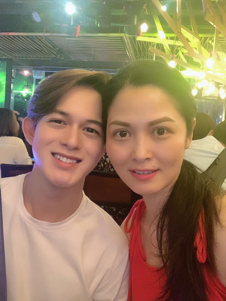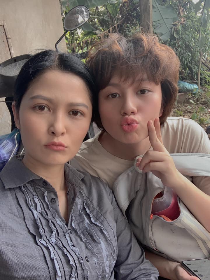 Thuý Hà chụp ảnh cùng Quang Anh trong tiệc chia tay đoàn phim.