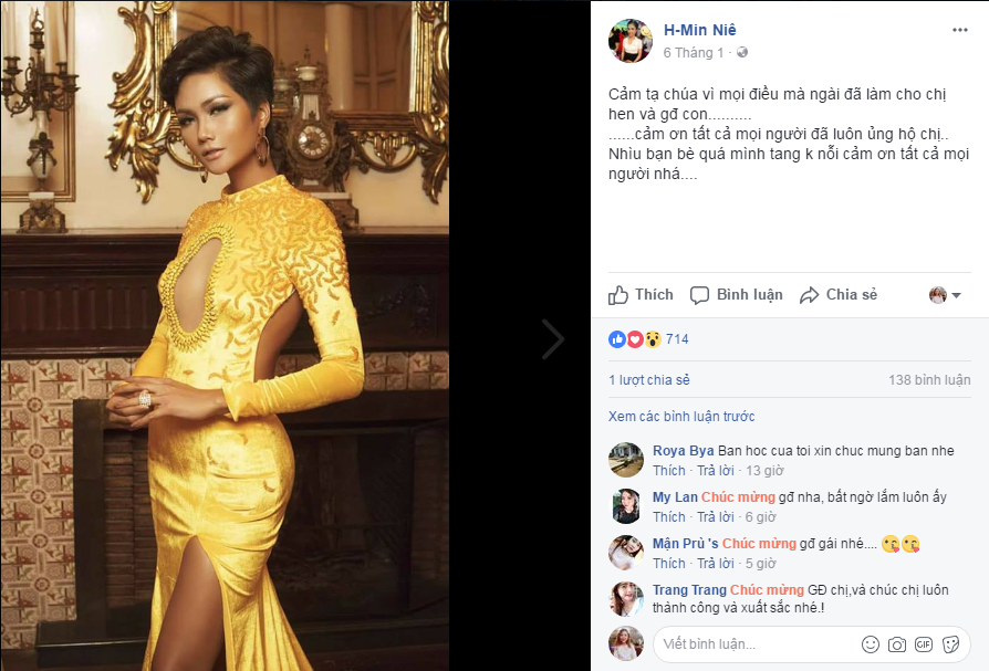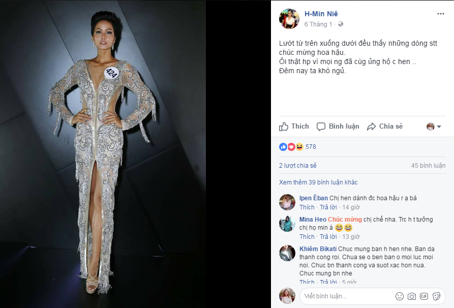 Suốt hành trình chinh phục danh hiệu Hoa hậu Hoàn vũ Việt Nam của chị gái mình, cô em gái H'Min Niê luôn dõi theo và hết mình cổ vũ. Ngay sau khi chị gái vừa đăng quang, cô vô cùng xúc động và liên tục gửi lời cảm ơn đến những người hâm mộ đã dành tình cảm và sự ưu ái cho chị H'hen Niê.