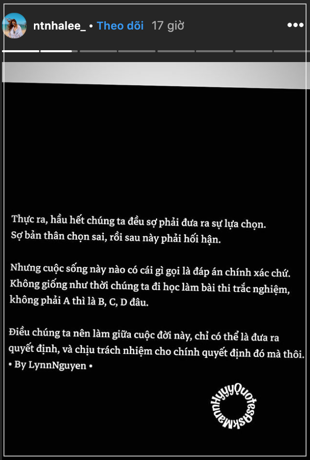 Bên cạnh đó, Nhật Lê còn có một dòng chia sẻ khá ẩn ý khác trên story. Bài viết ngụ ý nói Mỗi người đều sợ đưa ra sự lựa chọn. Sợ bản thân chọn sai hoặc sợ hối hận. Điều nên làm là phải đưa ra quyết định và chịu trách nhiệm cho quyết định đó.