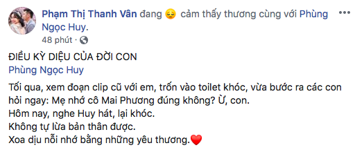 “Hôm nay, nghe Huy hát, lại khóc. Không tự lừa bản thân được. Xoa dịu nỗi nhớ bằng những yêu thương. Thương Phùng Ngọc Huy”, Ốc Thanh Vân xúc động viết.