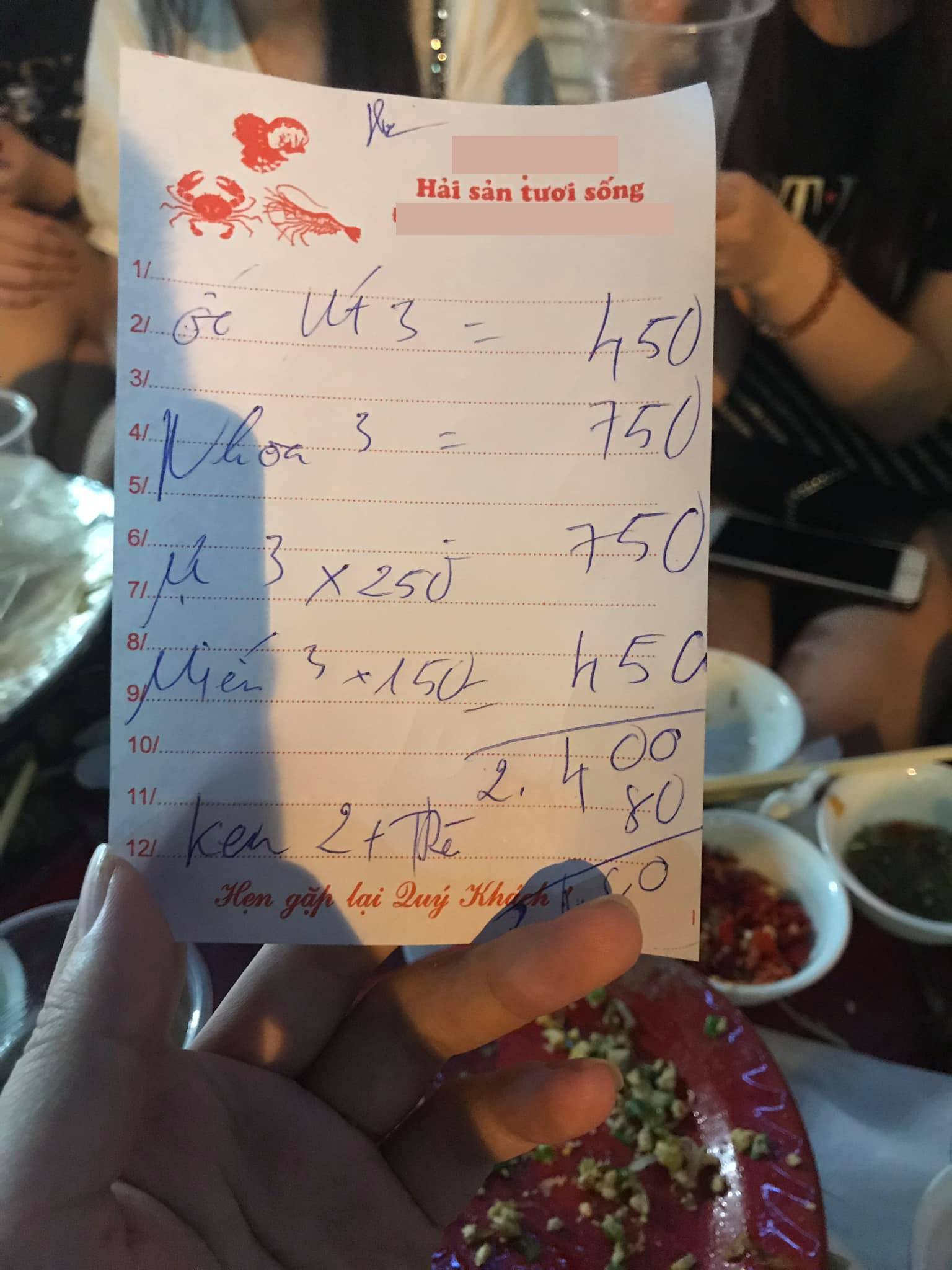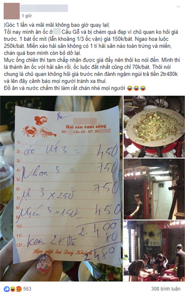 “Tôi từng đi ăn nhiều quán xá rồi, chỗ sang trọng đắt đỏ có, chỗ vỉa hè bình dân có nhưng chưa thấy chỗ nào tệ như nơi này. Lúc tính tiền, chủ quán “chém” 150k/bát ốc x 3 =450k, mực là 250k/đĩa x 3= 750k, miến xào trứng giá đỗ có giá 150k/1 đĩa x 3 = 450k; ngao có giá 250/bát x 3 = 750k. Thêm trà đá và bia, tổng thanh toán của nhóm bọn mình là 2 triệu480k“, anh Duy nói.