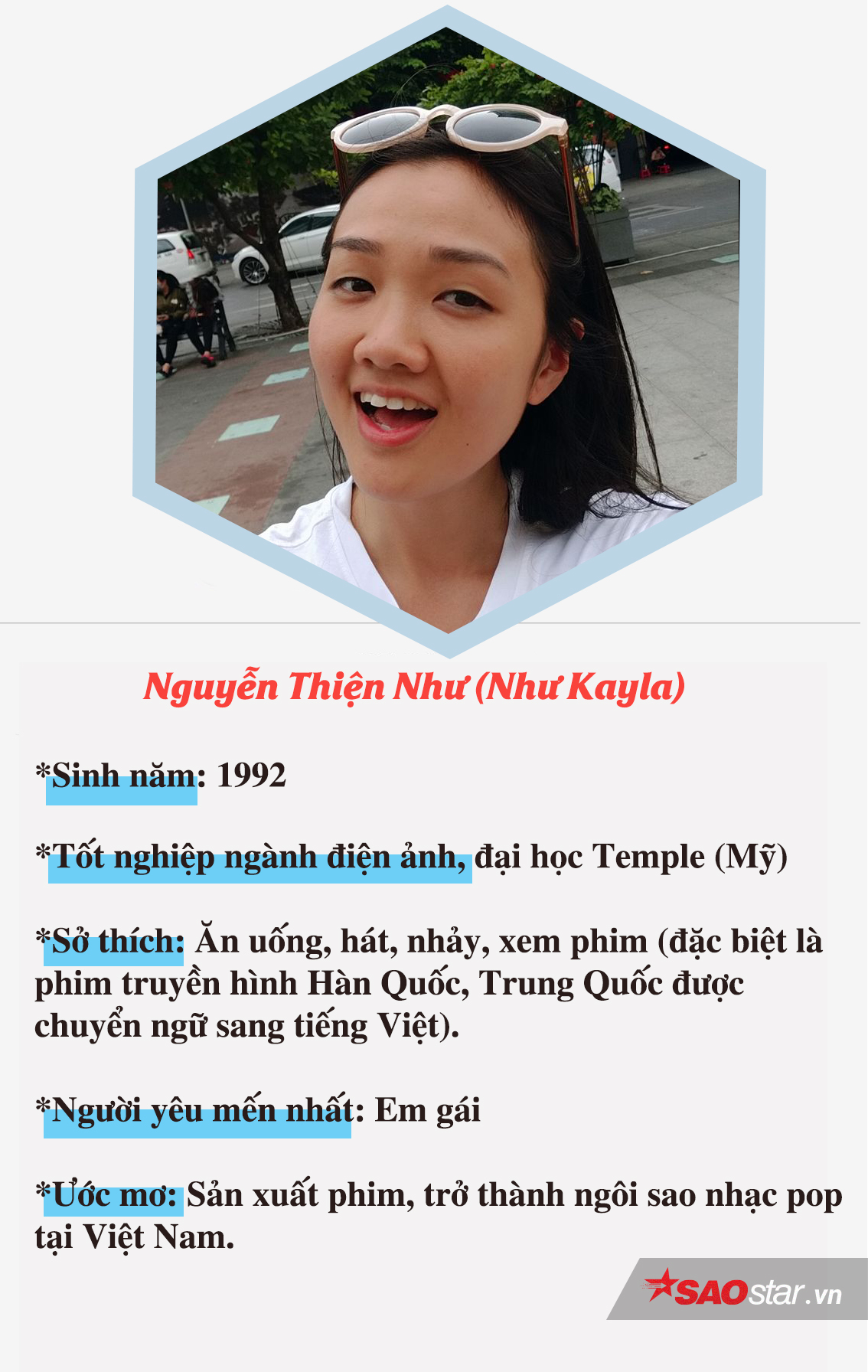 Như Kayla được sinh ra và lớn lên từ Mỹ, nên từ nhỏ cô đã được ba mẹ dạy tiếng Việt để giao tiếp trong sinh hoạt gia đình hàng ngày. Càng lớn Kayla càng hiểu thêm nhiều về văn hoá và con người Việt Nam nên cô quyết định thành lập ra fanpage Viegtlish để có thể chuyển thể các bài hát tiếng Việt sang tiếng Anh, hoặc biến tấu một bài hát nước ngoài thành vọng cổ chẳng hạn. Bên cạnh đó, Kayla còn tạo ra những video dạy tiếng Việt bằng bài hát cực kì vui nhộn từ hình ảnh đến âm nhạc. Tất cả những gì mà cô bạn này làm, với mong muốn “người Mỹ gốc Việt biết nói tiếng Việt và hiểu về Việt Nam hơn” - theo chia sẻ của Kayla trên một tờ báo.